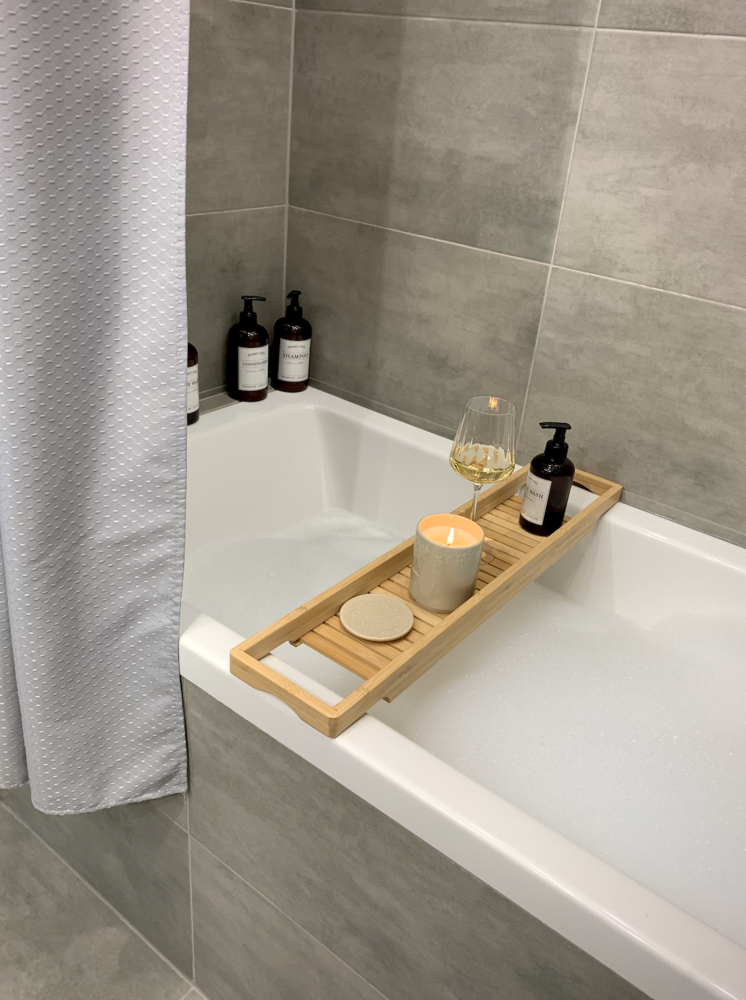 Ванна акриловая, покупали в «Кастораме» примерно за 12 тысяч рублей. Серую шторку нашла на «Али Экспресс» и немного доработала ее, добавив на нее люверсы.