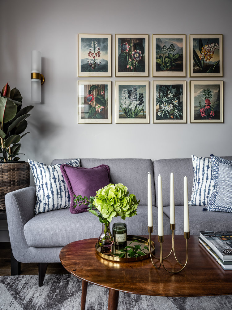 Постеры на стене за диваном были вырезаны из книги Taschen и обрамлены в багетной мастерской на заказ. Елена Музыченко привезла книгу из Испании именно для таких целей. Так цветы из альбома дождались своего звездного часа.