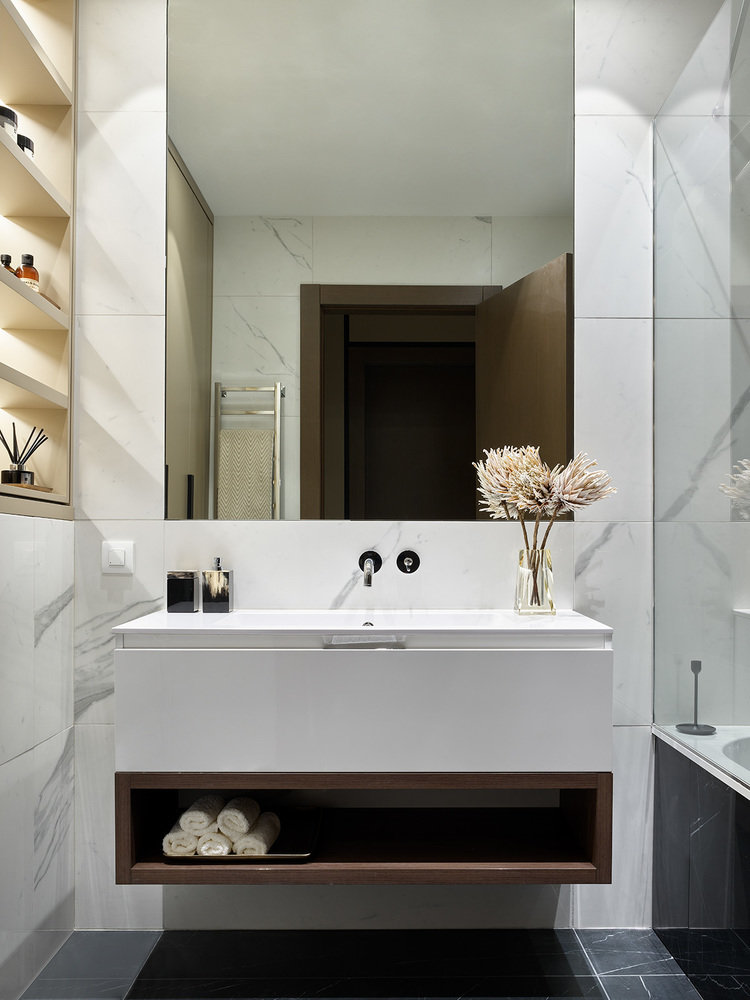 В санузле для отделки стен и пола использован керамогранит, также изначально уже были раковина, ванна, подвесная тумба, сантехника.