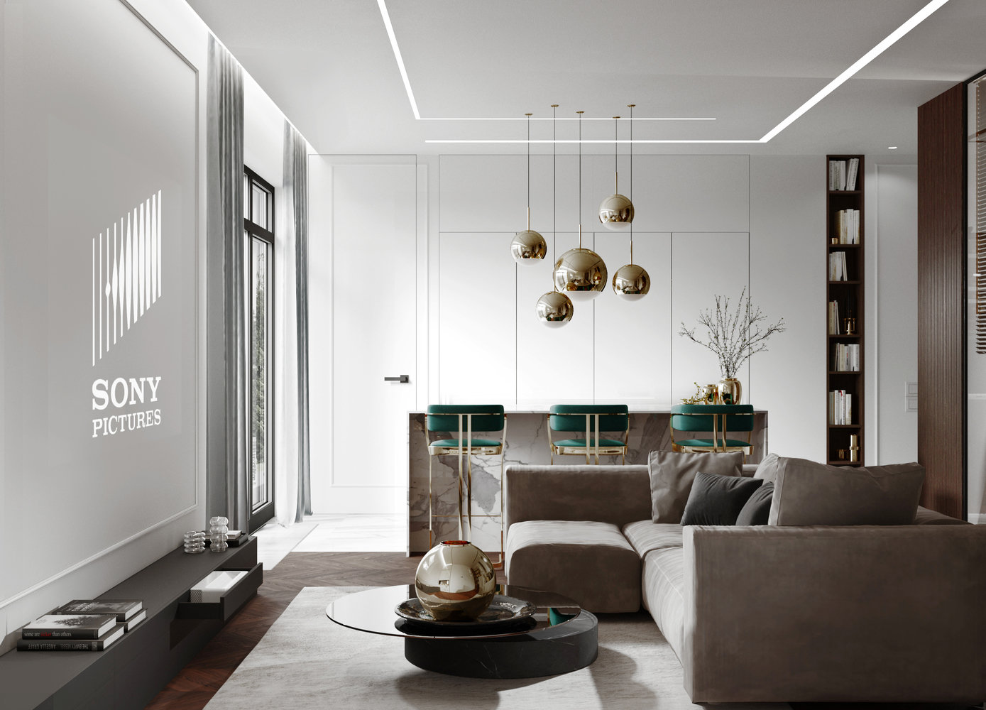 Вместо телевизора разместили проектор, который также замаскирован и при необходимости выезжает из полки.
