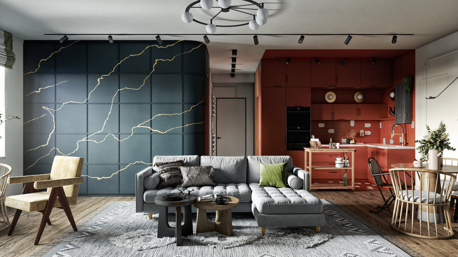 Шкаф выстроили симметрично кухне, чтобы получилось два равнозначных цветовых блока. Фасады украсили золотистыми линиями, которые напоминают молнии на темном небе.