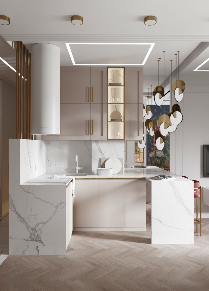 Заказчица хотела получить светлый, легкий интерьер в стиле современной классики с молдингами и элементами золота. У дизайнера появилась идея создать «восточную сказку». В результате проект получил название «Ночь Шахерезады».