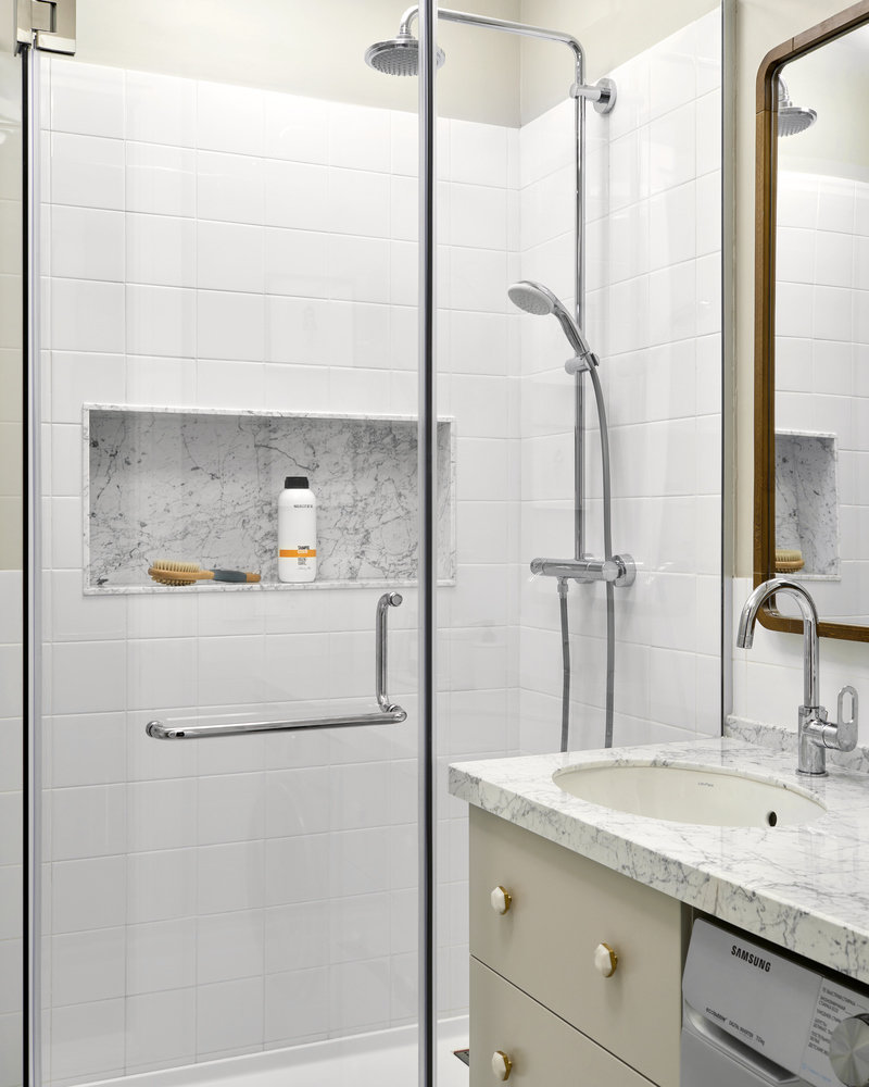 В отделке ванной использовали кафельную плитку. Столешница и ниша сделаны из каррарского мрамора.