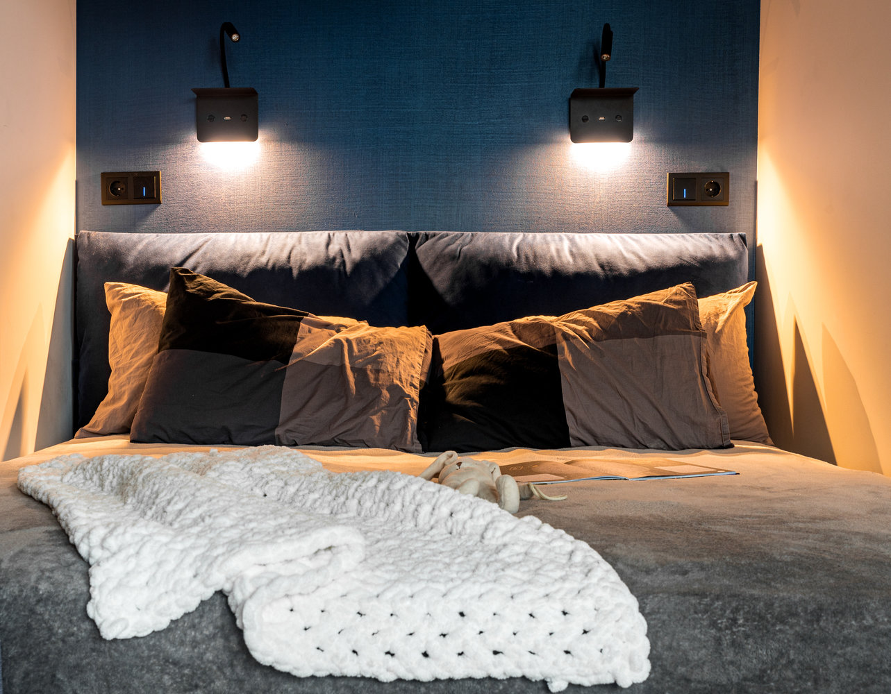 Рядом с изголовьем разместили бра с полочкой для телефона или книги, с USB-разъемом, чтобы удобно заряжать телефон.