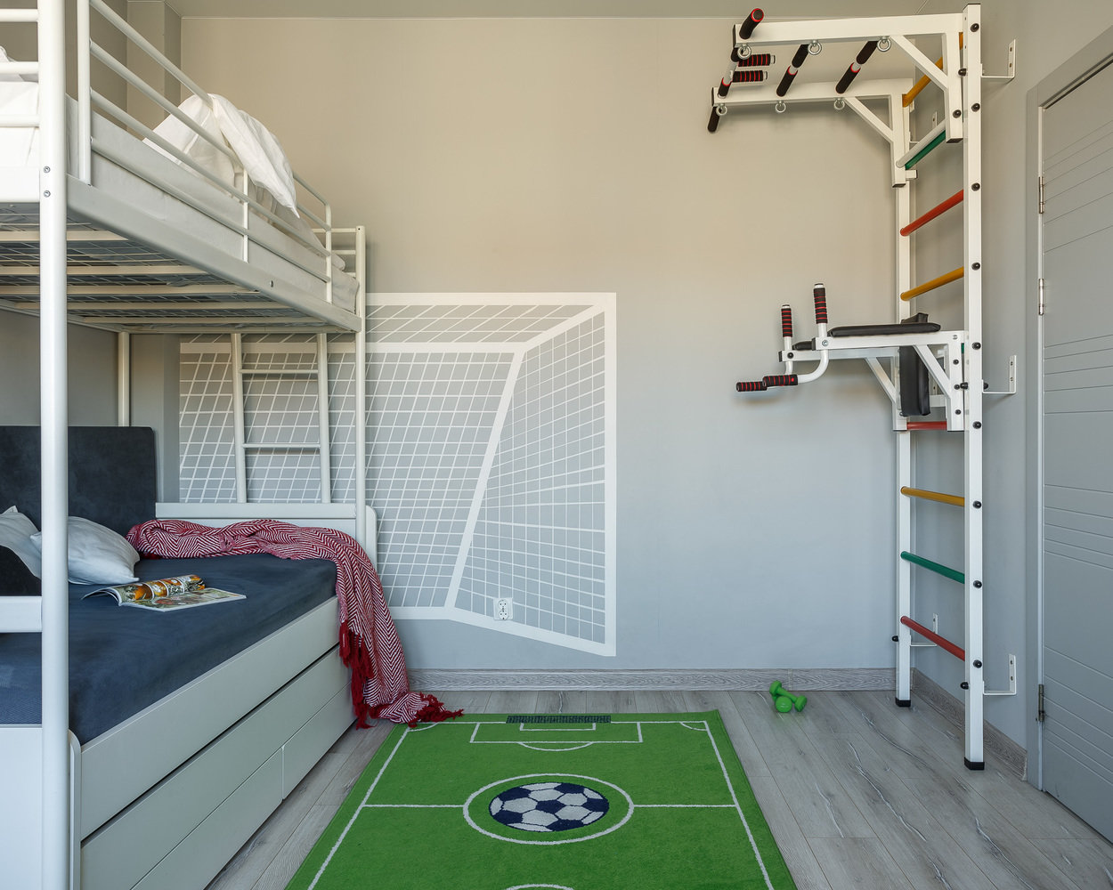 Кровать двухъярусная. Даже правильнее будет сказать трехъярусная. Под первым ярусом предусмотрели раздвижную кровать на случай, если кто-то из гостей захочет остаться. Тут же есть уголок для шведской стенки, ведь спорт и движение — это образ жизни мальчишек.