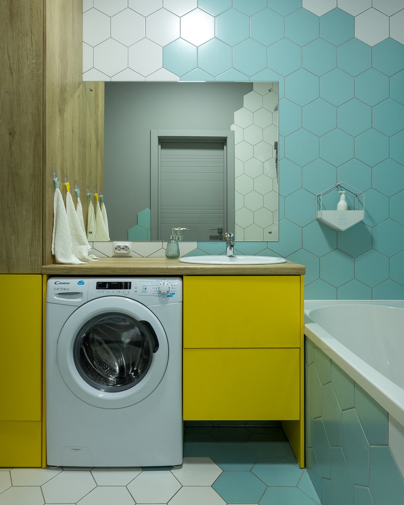 Использовали плитку в форме гексагона в «мокрых» зонах. В сухих осталась окрашенная часть. Собственно, плитка и стала объединяющим элементом — она завязала между собой все открытое пространство прихожей, гостиной и санузла.
