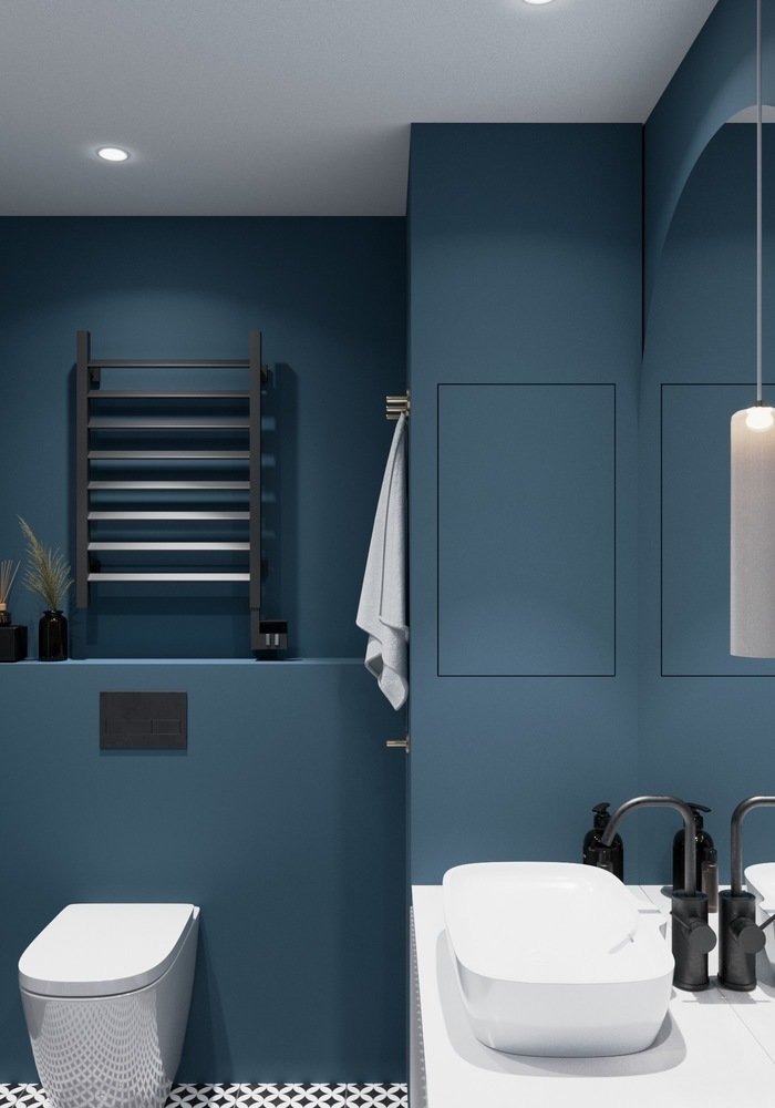 В большом санузле за счет использования проточного водонагревателя получилось создать большое количество мест под хранение.
