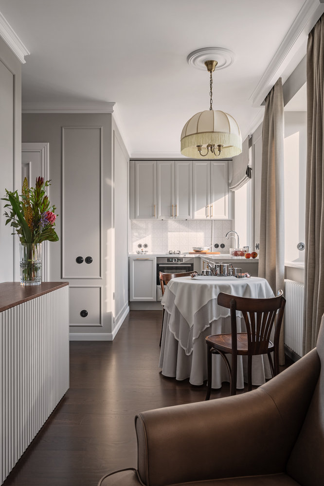 На кухне есть только самое необходимое: плита на две конфорки, компактный духовой шкаф с функцией микроволновки, вытяжка и спрятанные под столешницей холодильник и морозилка. В секции под мойкой установлен фильтр для воды, а остальное пространство отдано под хранение.