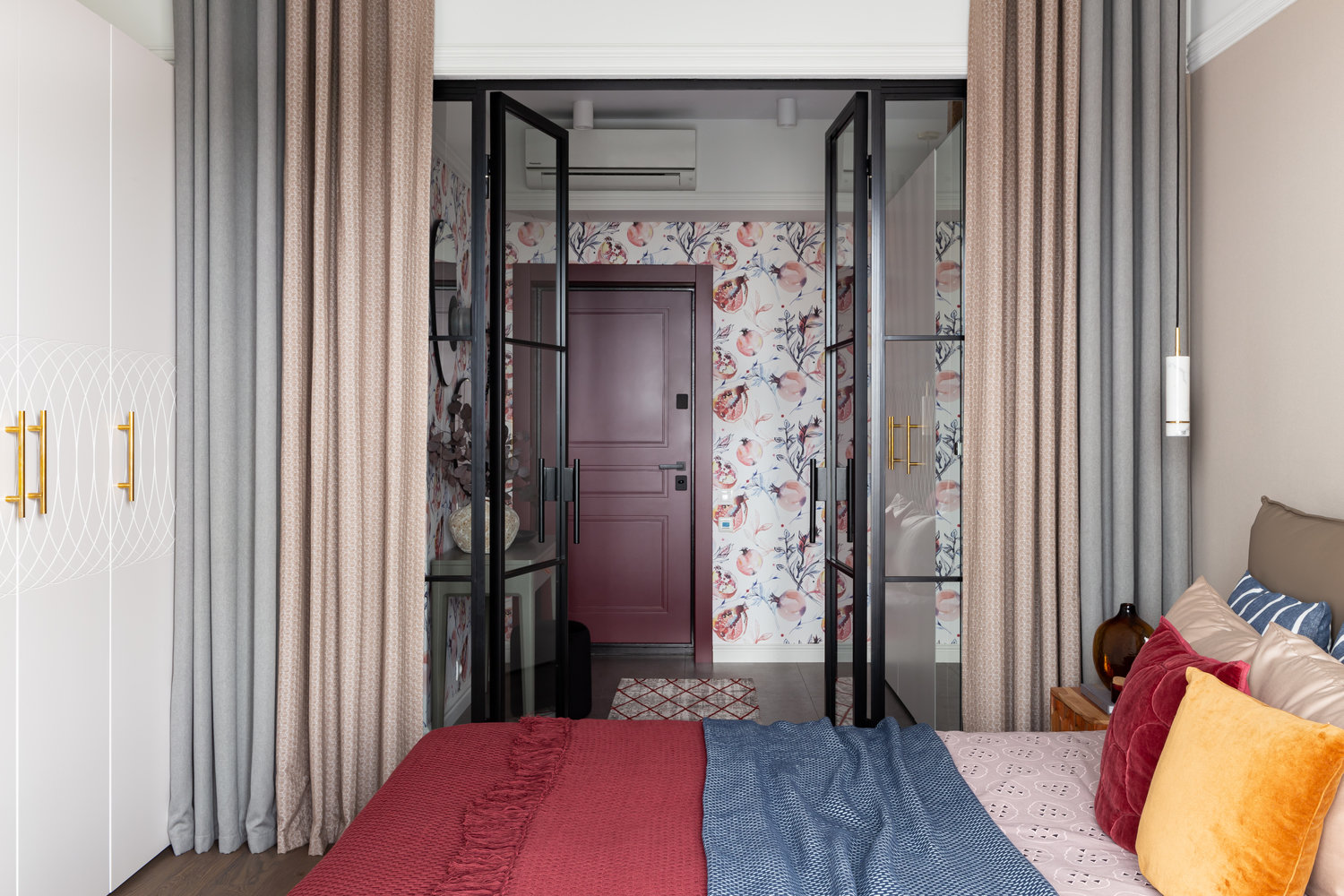 Спальню отделили от прихожей прозрачной перегородкой, а для приватности повесили плотные шторы.