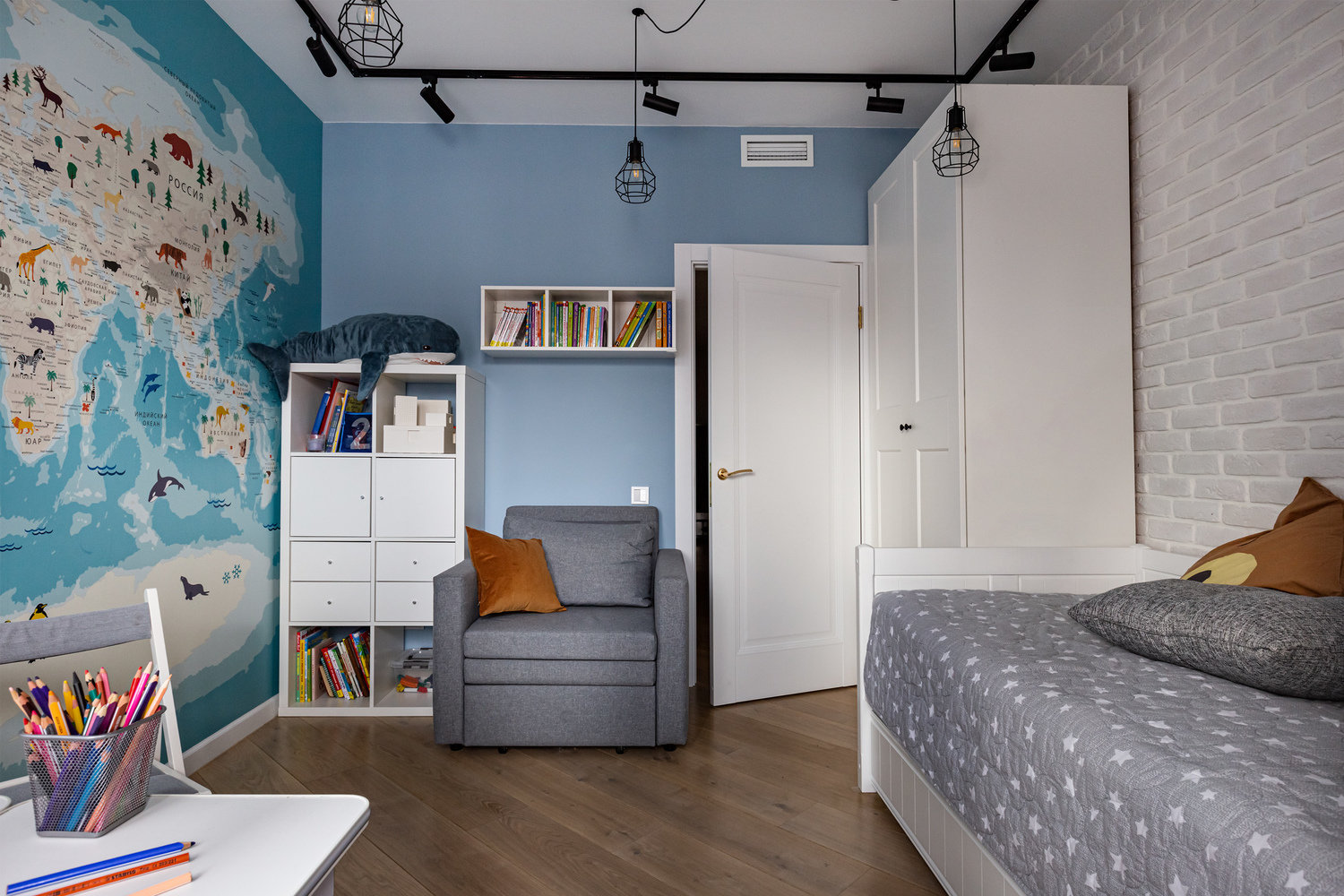 В детской старшего сына две основные зоны: в них расположили рабочий многофункциональный стол, кровать с телевизором, раскладываемое кресло для гостей, шкаф и места хранения. Также в комнате старшего сына есть лоджия, на которой он летом играет и отдыхает.