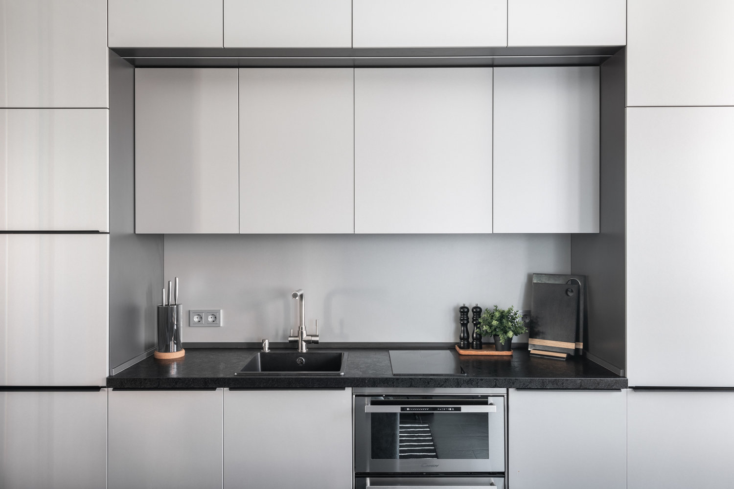 Столешница и фартук сделаны из ЛДСП. Это один из самых бюджетных материалов, при этом прочный и легкий в использовании.