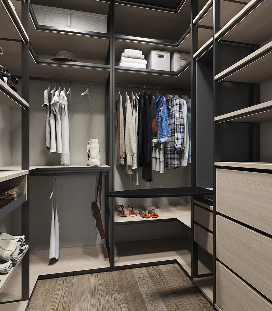 Гардеробная в спальне металлическая, с элементом выдвижной гладильной доски.