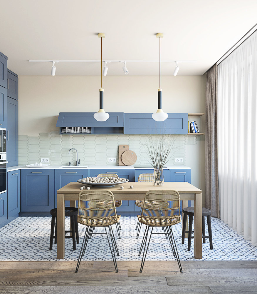 На кухне подобрали белую столешницу к синему гарнитуру и мятной плитке для ощущения воздушности. По этой причине также не стали доводить гарнитур впритык к стене, а плитку на фартуке выложили со смещением.