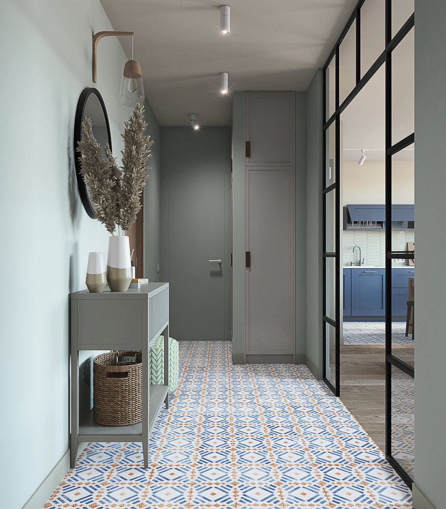 В прихожей и дальше в коридоре использовали красивый оттенок краски для стен, а для пола выбрали плитку с разноцветным принтом. Это делает интерьер динамичнее и интереснее.