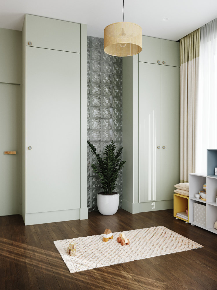 Перегородку из стеклоблоков обрамили с двух сторон шкафами, получилось органично.