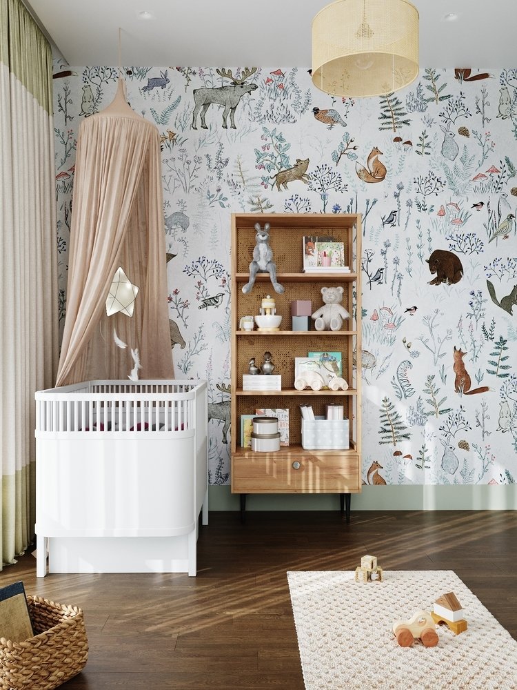 В детской сделали ставку на обои с лесными животными, их будет интересно разглядывать.