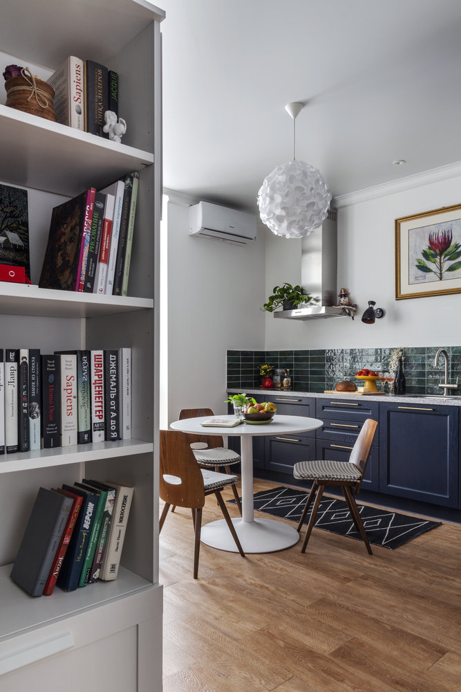 Круглый стол мобильный, его можно переставлять. Ретростулья дополнили обивкой с рисунком «гусиная лапка».