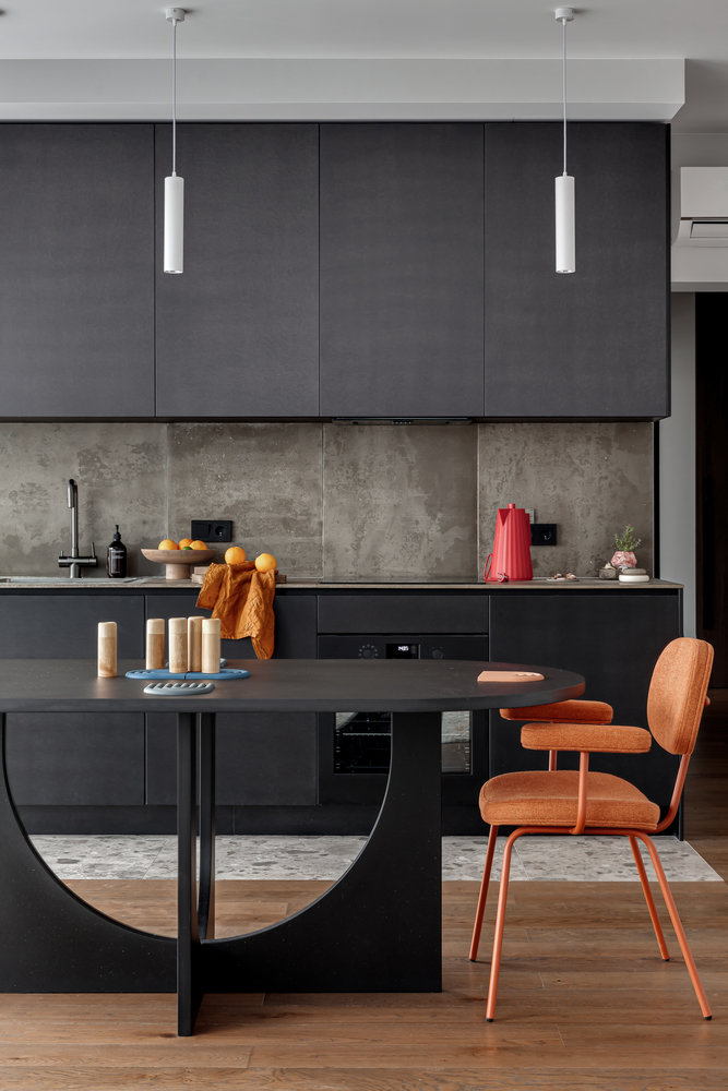Фартук выполнен из валхромата. Этот материал похож на МДФ, основные отличия: повышенная влагостойкость, большая плотность (на 30%), возможность создавать 3D-фактуру благодаря однородности всей глубины панели. Это было желание заказчика.