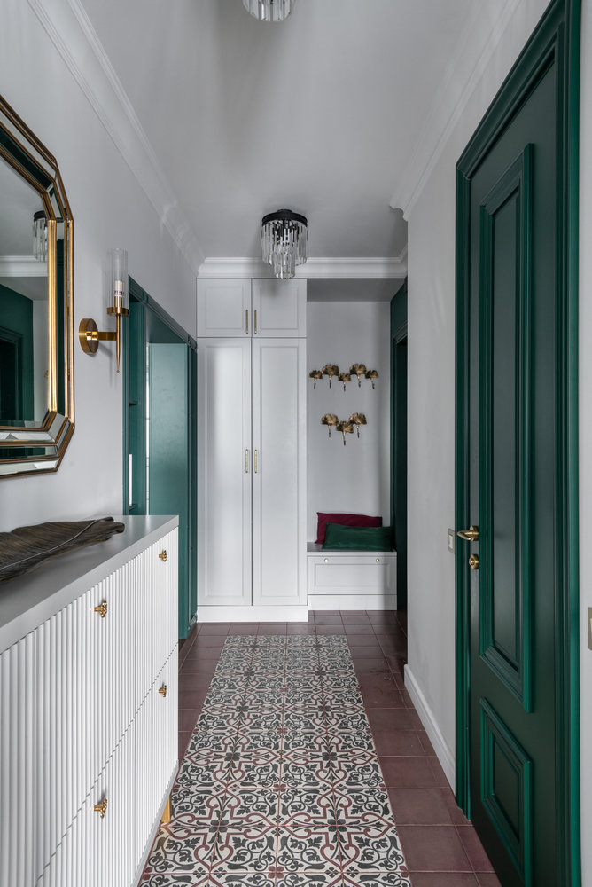 В квартире нет отдельной гардеробной, поэтому в каждом помещении предусмотрели шкафы в потолок.
