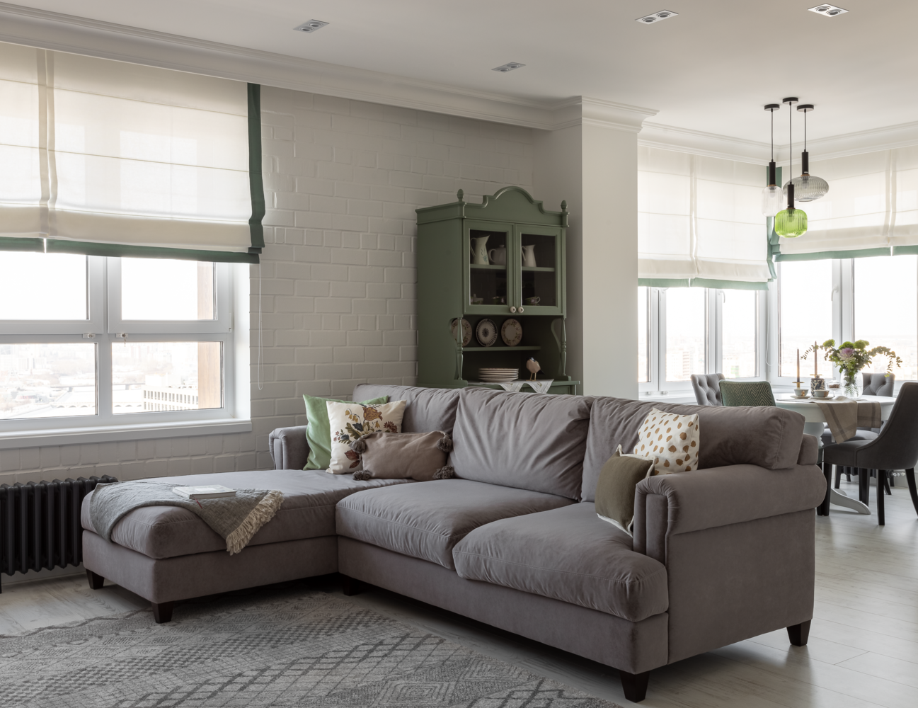 В качестве напольного покрытия выбрали белый ламинат, чтобы он не обращал на себя внимание, был фоном для цвета. Кирпич на стенах изначально был в хорошем состоянии от застройщика, его почистили и покрасили краской.