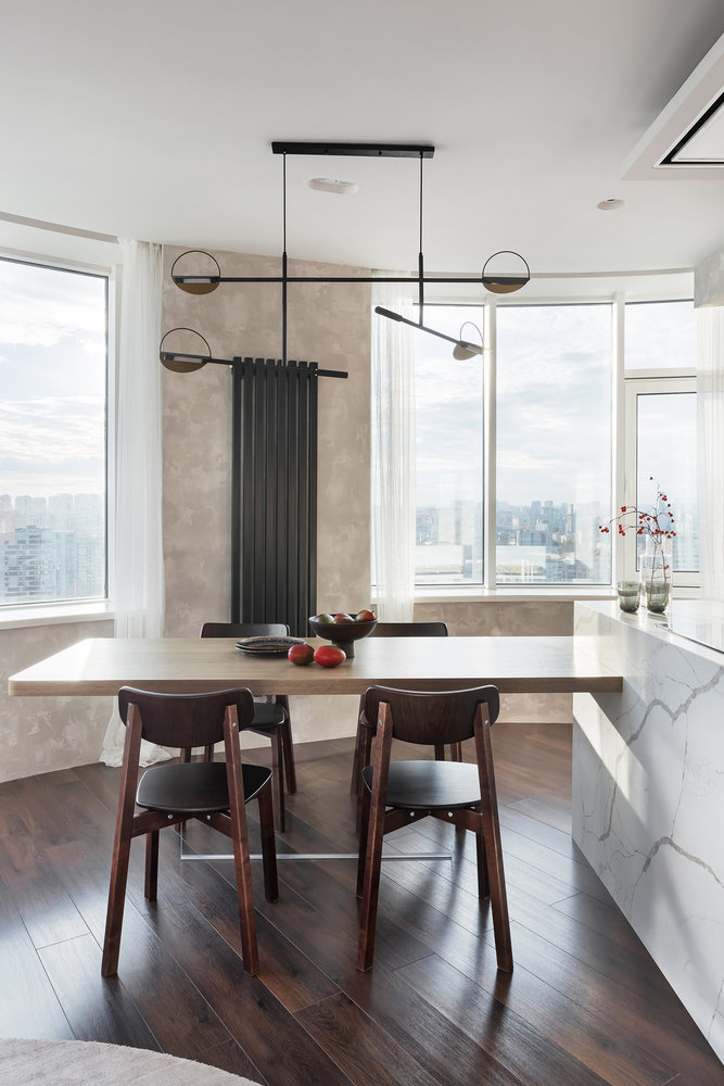 Декоративная штукатурка служит плавным переходом от светлого к темному на стенах в гостиной. Декоративная штукатурка в зоне рабочей поверхности кухни не боится влаги, и за ней легко ухаживать даже щелочными составами.