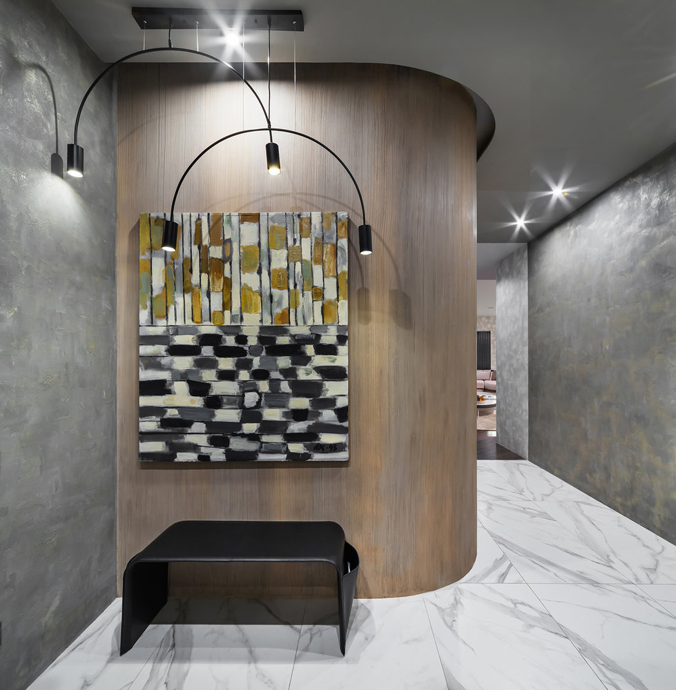 Трешка с радиальной планировкой и необычной отделкойДизайн