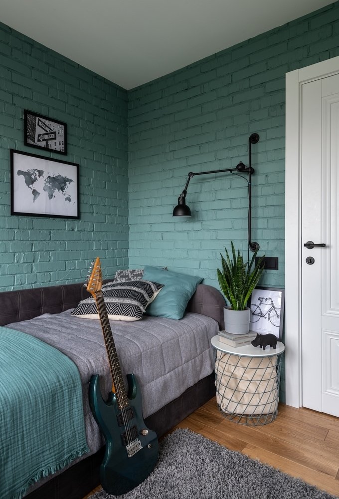 Акцентная стена из кирпича — уже сама по себе достаточный стилеобразующий элемент, поэтому оставшиеся стены просто покрасили в серый цвет. Кирпичная стена возведена из обычного строительного чернового кирпича, загрунтована и покрашена — таким образом сэкономили и создали эффект старой расчищенной стены.