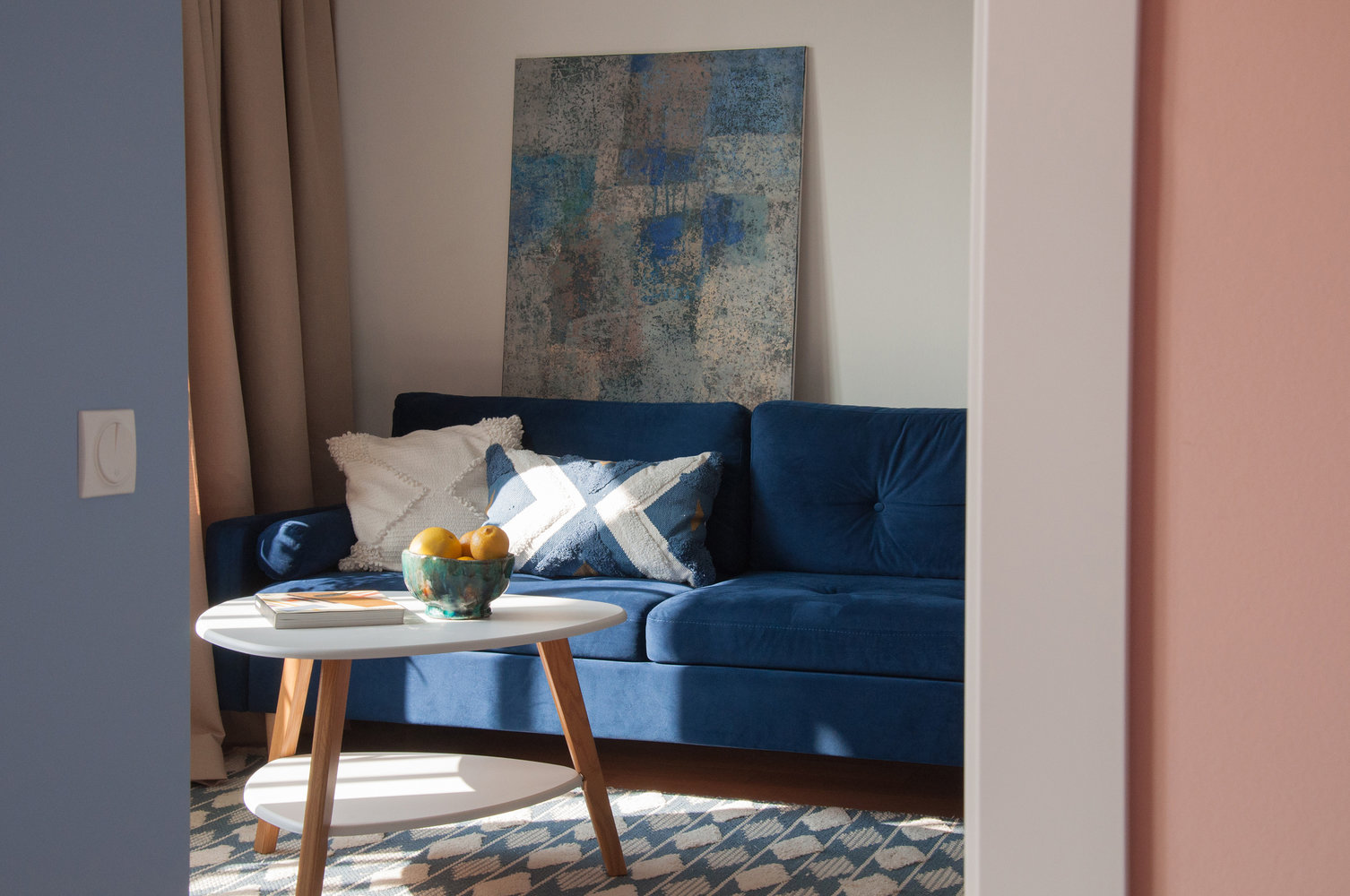 В гостиной стены в основном белые, и акцент сделали на ярко-синем диване. Его дополняют ковер, текстиль и декор также в оттенках синего и голубого.