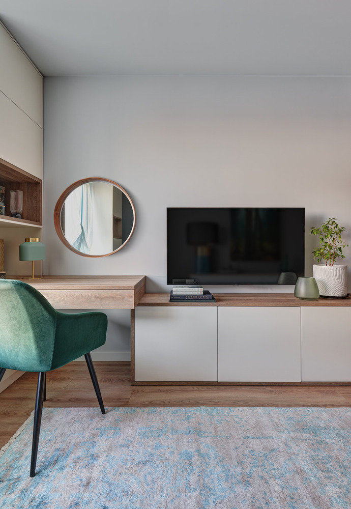 Двушка 40 м² с кухонным островом и лавкой у окнаДизайн