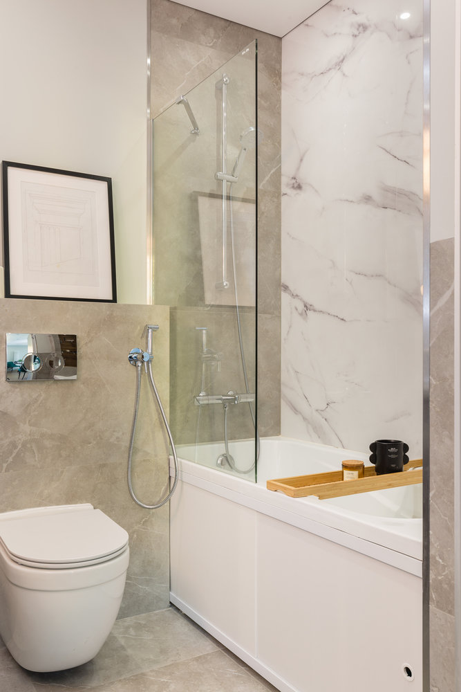 За ванной заказчики хотели бесшовный рисунок мрамора. Поэтому выбрали панели Alumoart.