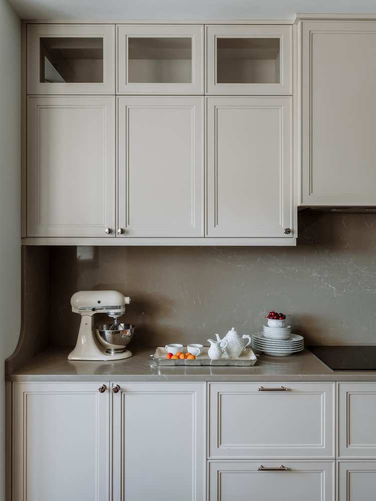 Для симметрии сделали два распашных ящика, под мойкой разместили выдвижную секцию. Кухня спроектирована на заказ компанией Attribute.