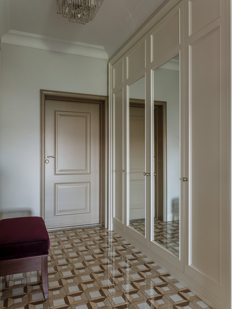 В квартире спроектировали секретное место для стиральной и сушильной машин прямо в прихожей за скрытой дверью. А с другой стороны разместили в нише двухдверный холодильник и колонну с духовым шкафом.