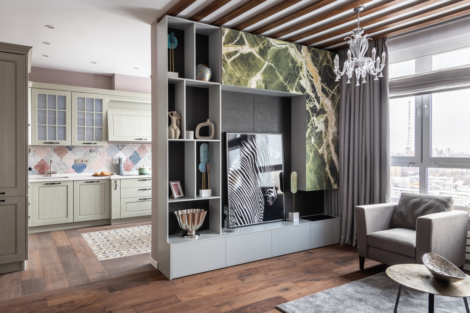 Хотелось подчеркнуть красивый вид из окна, поэтому вместо привычного тюля для гостиной были выбраны римские шторы.