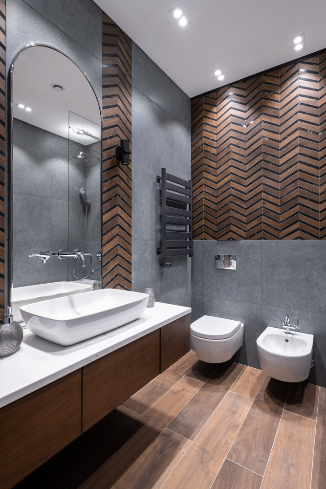 В сером санузле акцентом стала плитка-мозаика Atlas Concorde, которая соединила в себе дерево и мрамор. Смотрится очень эффектно и задает определенный ритм, а зеркало со смесителем на нем — это особая любовь.