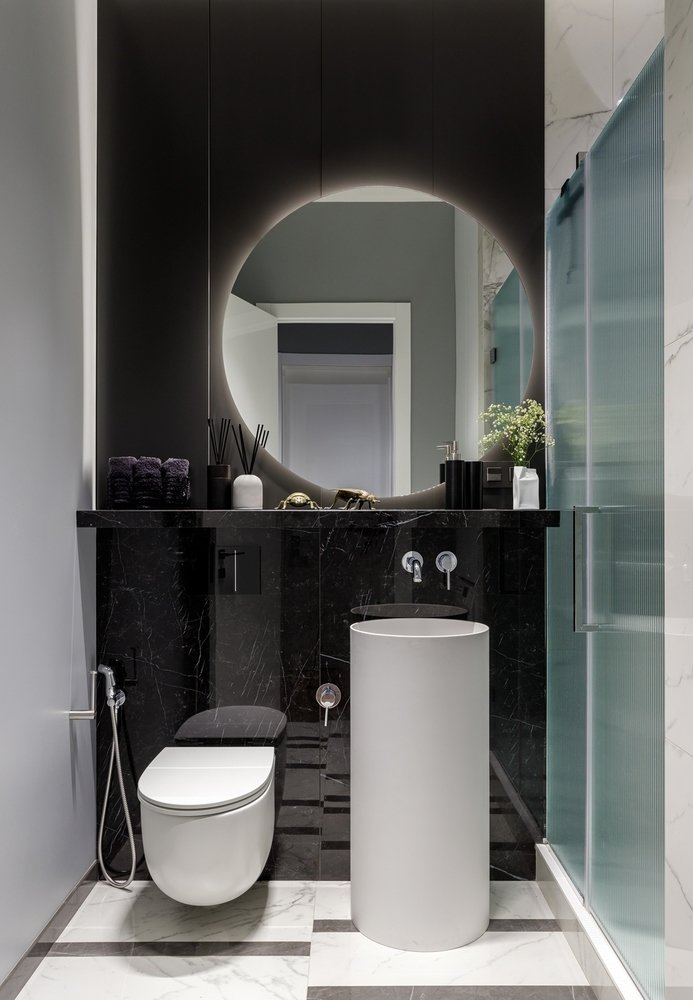 В душевой использовали рельефное стекло, так как оно менее прихотливое в уходе. На полу и стенах положили керамогранит.