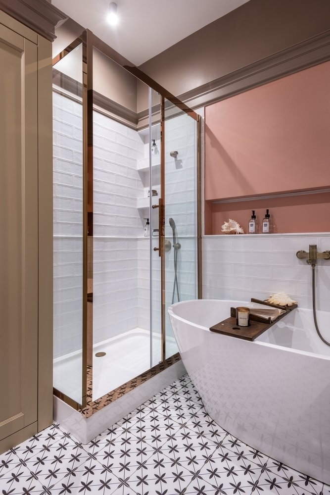 Площадь санузла позволила установить отдельно стоящую ванну и душевую.
