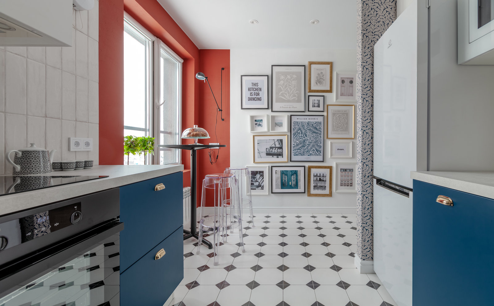 Зону для завтрака выделили покраской стены около окна в яркий оттенок. Заказчица хотела разместить много фотографий. Для нее создали галерейную стену на кухне. Картинки и фотографии на ней можно менять по настроению и сезону.