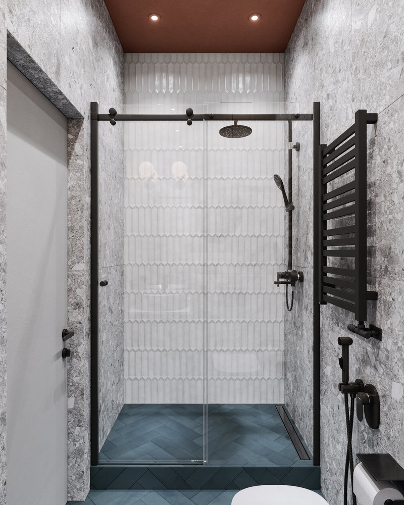 В отделке душевой зоны использовали белую плитку с фартука кухни.