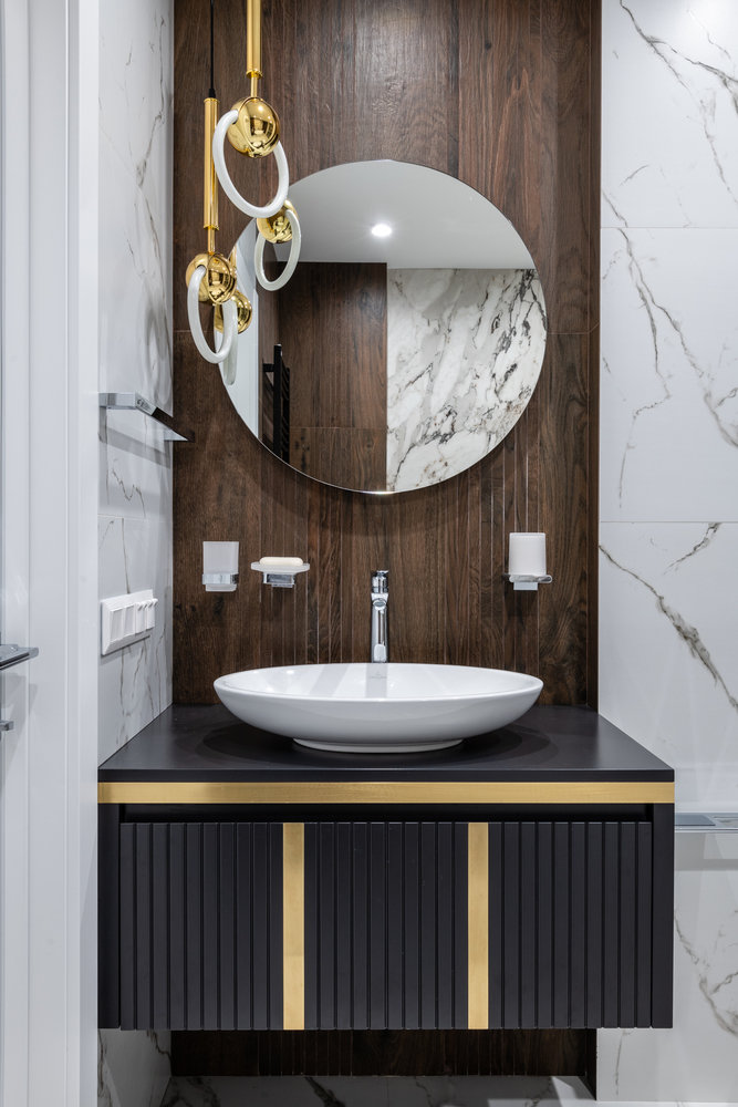 Отдельного внимания заслуживает фрезерованная тумба с золотыми вставками, которую спроектировали и выполнили на заказ.