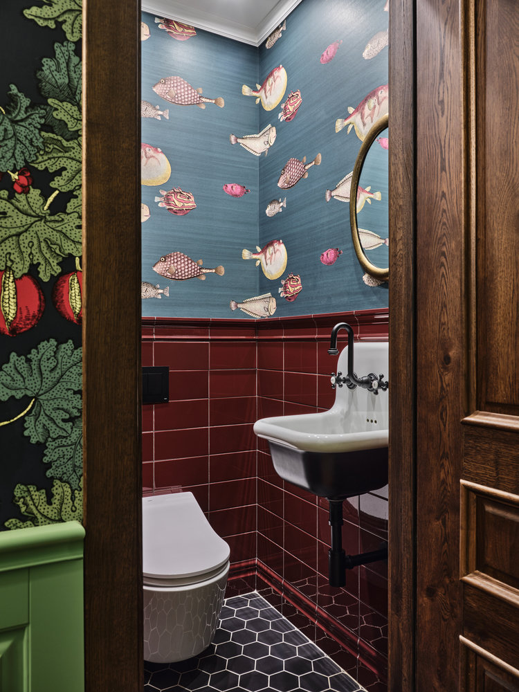 В пару обоям выбрали плитку красивого вишневого оттенка. Дизайн раковины также не банален и привлекает внимание.