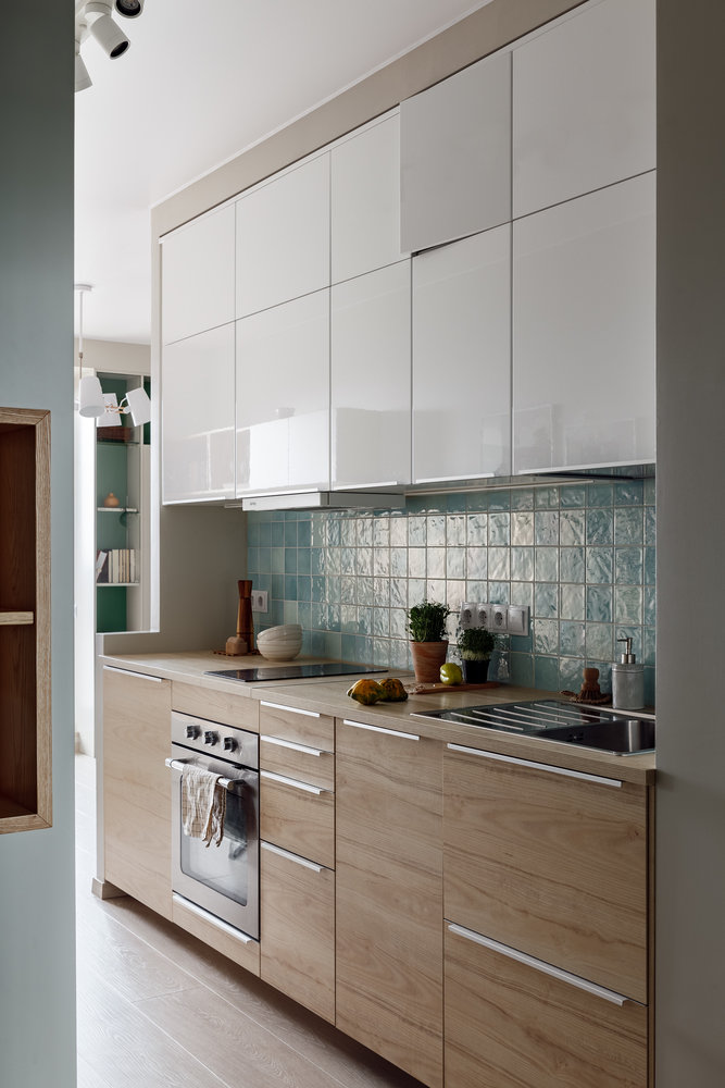 Студия 34 м² с продуманным хранением и проходной кухнейДизайн
