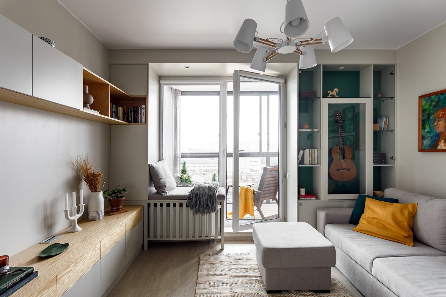 Студия 34 м² с продуманным хранением и проходной кухнейДизайн