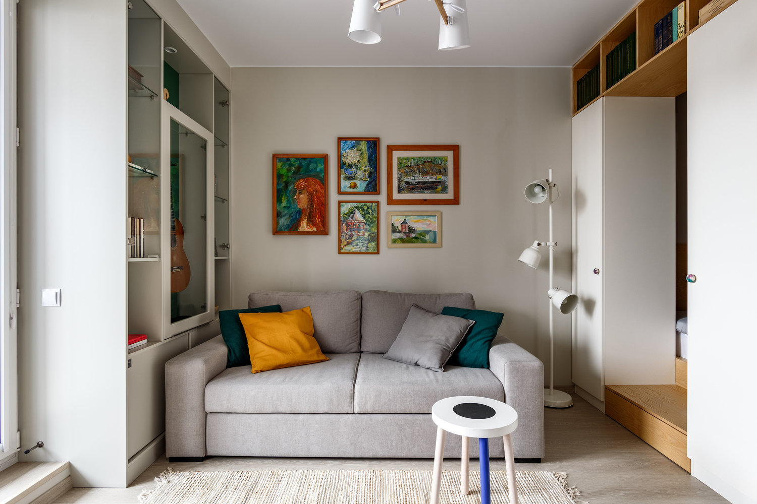 Студия 34 м² с продуманным хранением и проходной кухнейДизайн