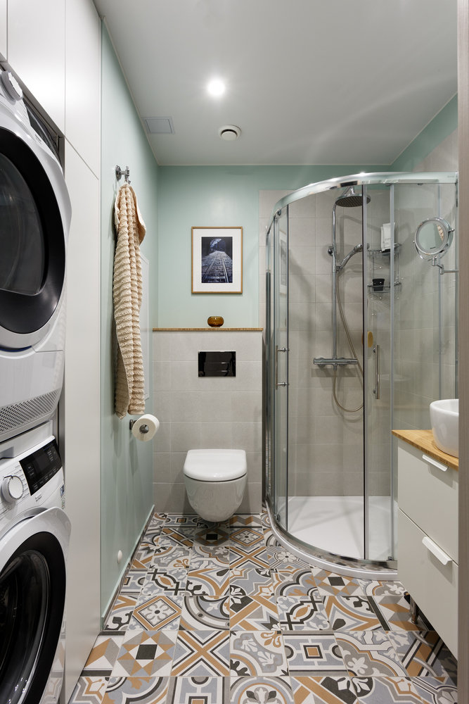 Студия 34 м² с продуманным хранением и проходной кухнейДизайн