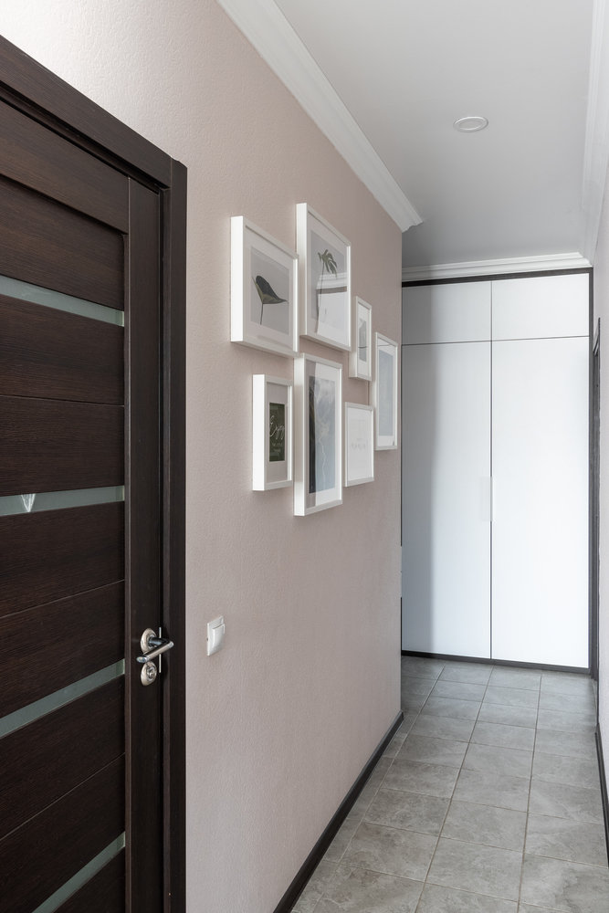 Вся корпусная мебель выполнена на заказ. В прихожей встроен вместительный шкаф для хранения верхней одежды, обуви. Шкаф выполнен от пола до потолка, что позволяет на верхних ярусах организовать дополнительное хранение.