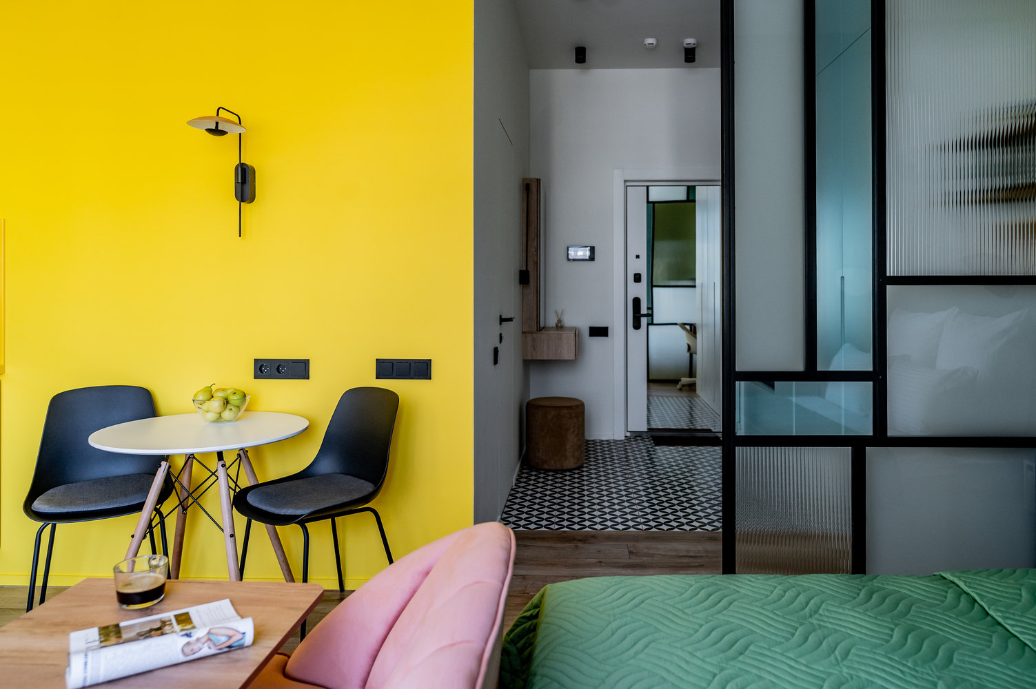 Крошечная студия 29 м² с классной желтой кухнейДизайн