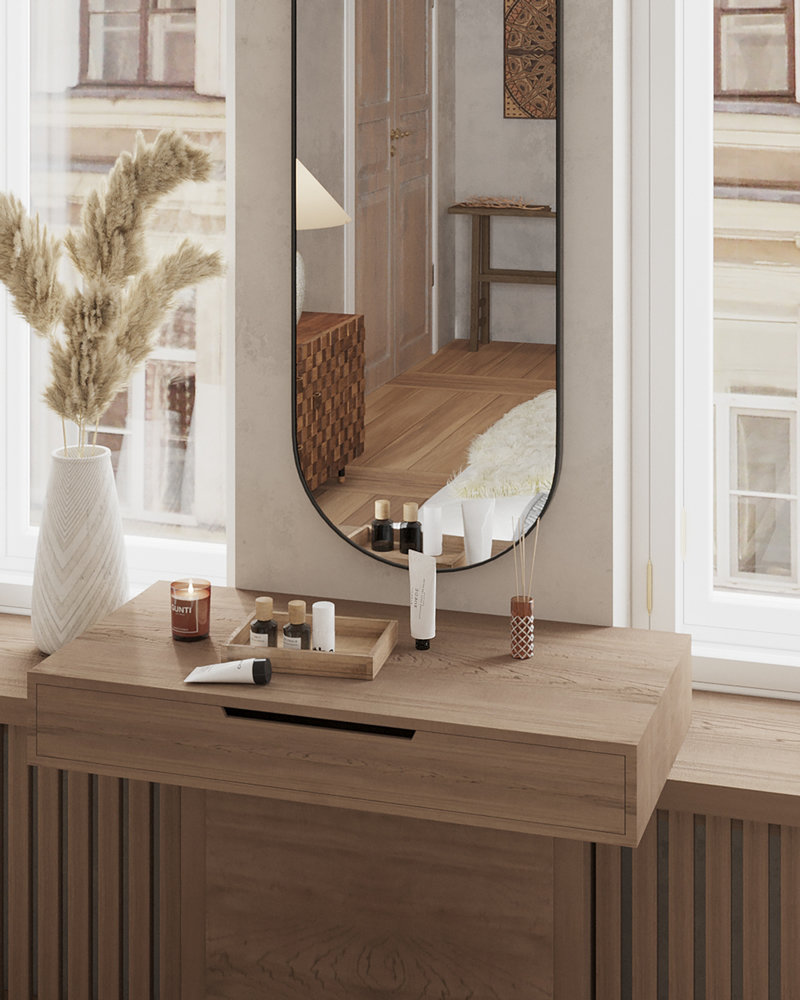 Системы хранения и кровать изготавливаются в России по эскизам дизайнера. Самая сложная конструкция — подоконник со встроенным туалетным столиком.
