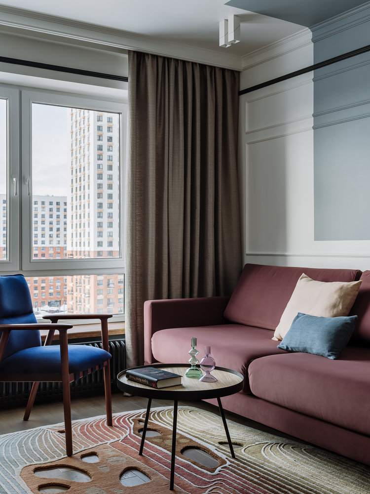 Дизайнер выбрала обивку красивых оттенков, которые перекликаются с цветами, использованными в создании интересного ковра. Именно такие детали делают интерьер стильным и уникальным.