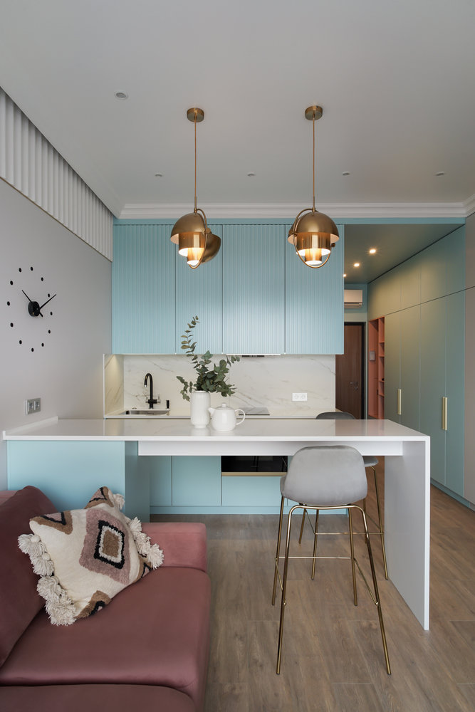 Вся мебель в этой квартире изготавливалась на заказ по проекту дизайнера. В гарнитуре предусмотрена встроенная ПМ на 45 см, варочная панель на две конфорки, над ней встроенная вытяжка, духовой шкаф с функцией СВЧ, встроенный холодильник. Верхние шкафы до потолка. Хранение ложек и вилок спрятано в острове.