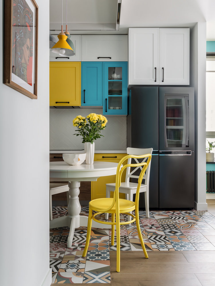 Дизайнер предложила скомбинировать фасады желтого, голубого цвета и под дерево. Получилось необычно и очень в духе заказчиков.
